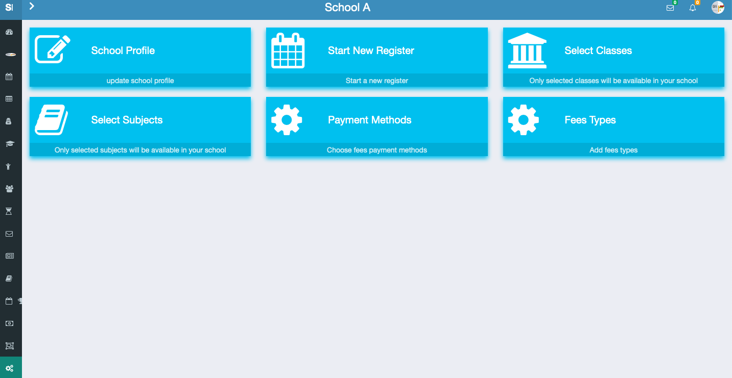 Admin settings let's admin manage school profile, admin can change school logo, school's profile picture, update fax number, telephone number, school's email id, address, website URL. Admin can change/select classes, their sections and the subjects to be taught in class. Admin can choose and enable types of payment options for students fee submission. Admin can add new fee, change fee types and make them in active. A screen shot of admin settings is given below